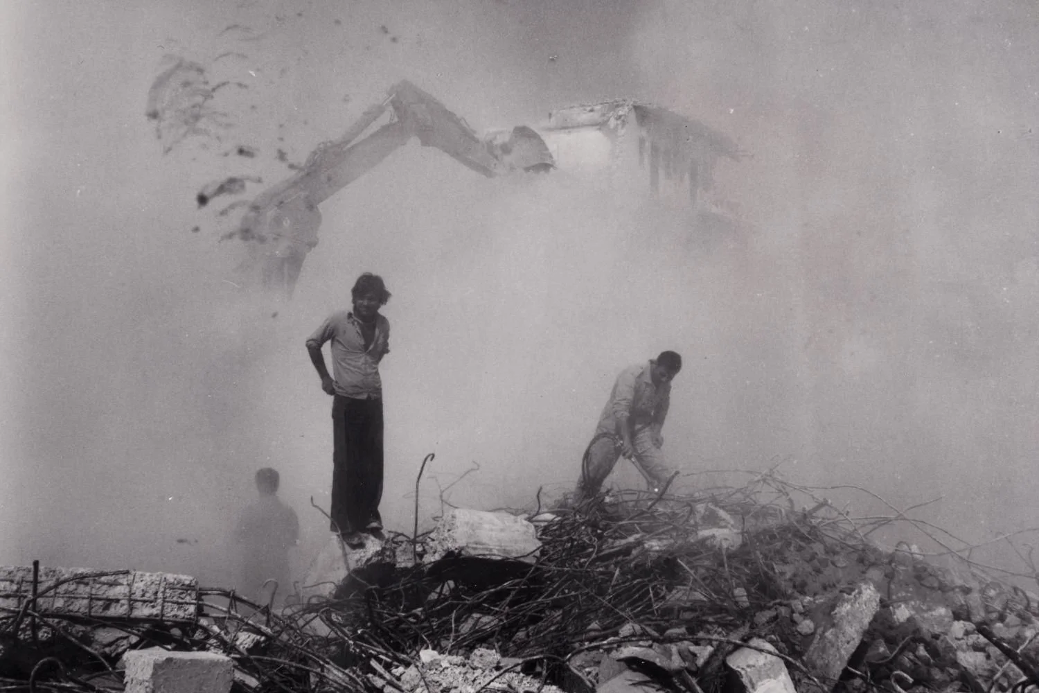 This essay transposes a mirrored reflection of two states of being– the absurd and the real –one a continuation of the other. In a sequence I have superimposed (FIG. 01-02), two men are seen in the process of a building’s demolition with the iron anatomy fragmented. A cloud of dust settles on the laborers. In a downward gaze, the gesture is reciprocated from Chadirji’s depiction of wedding preparations within an outdoor kitchen. The foreground of a human experience is then met with these two symptomatic extremes – both cosmologies against inertia and fixation. One propels movement, the demolition, the other propels movement in a social hierarchy of union. Paul Virilio’s Aesthetics of Disappearance suspends such an inquiry: “[a] desire for movement is only a desire of inertia, desire to see arrive what is left behind.” An architect’s labor of discourse is not limited to his words, but rather the phenomenology of sights that constitute his making-of. In his critical treatise Concepts and Influences: Towards a Regionalized International Architecture (1986), Chadirji disclosed: “I have therefore defined architecture as an artefact in a state of repose which manifests itself to us a form.” How then does this ‘repose’ manifest if not stabilized through the photographic image?