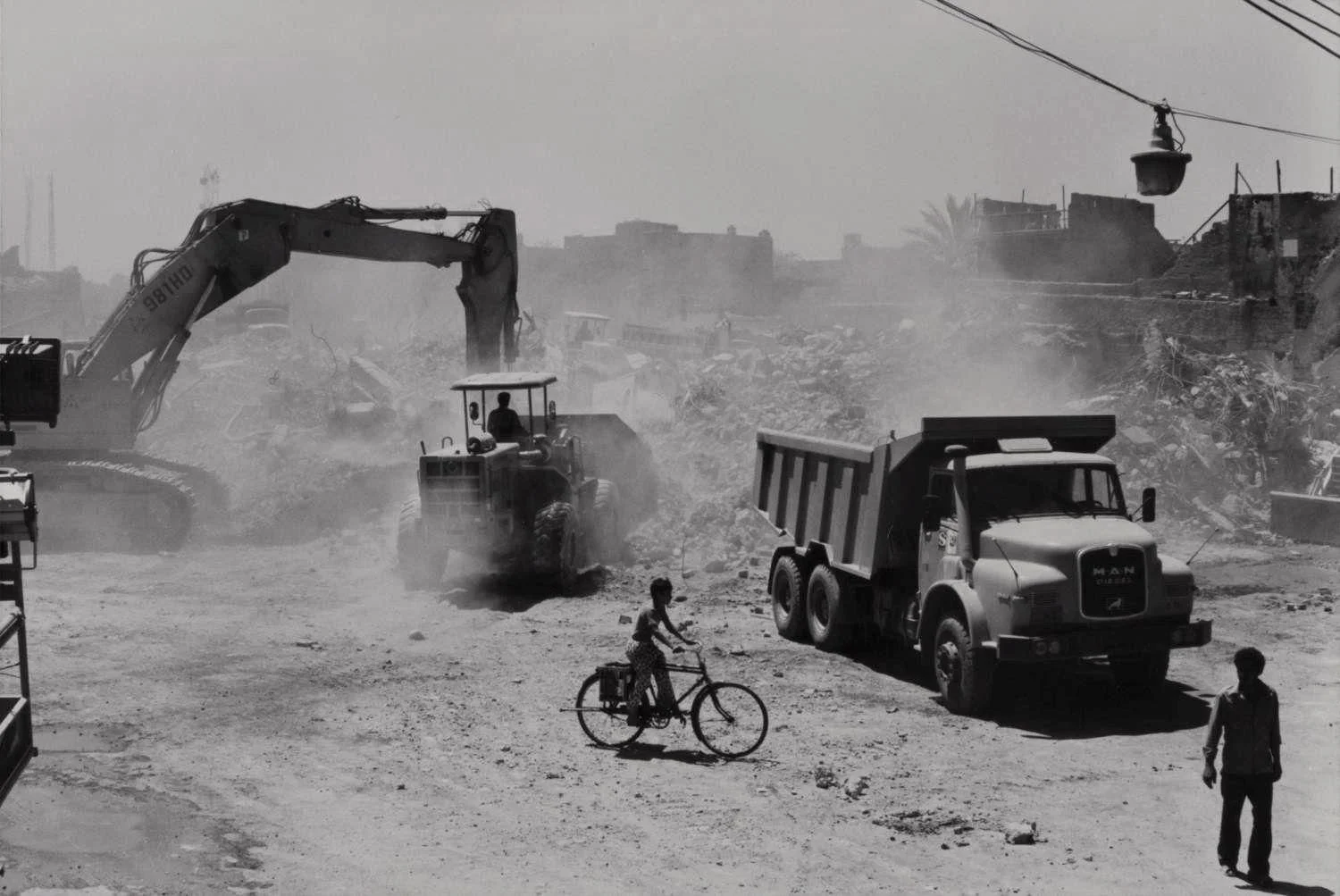 For Chadirji, the photographic medium is a mirror that portrays consciousness, discovered through the apparatus of a camera and at a chronological timeline following the completion of a design. One then begs to question the sight of demolitions – a large corpus survives within the Chadirji archive. If we can believe that Chadirji inhabited the media through his reflections in a similar method to how he viewed the ‘art’ of building, then the critique remains across both interventions of sensibility. The representation of demolitions is noteworthy of mention due to its cementation of disappearance. Image sequence FIG.03-07 showcases variant perspectives of the demolition process – yet in all of them, the human presence is felt and accompanied by the vast expanse of land that is in a state of transition. Black-veiled women cross the street, a boy with a bike is seen in the area of current ‘destruction’, a young boy is framed in contrast to the remaining wall of a domestic building. The photographs form a gesture that even within sites of demolition, public life is not excluded from the perceived devastation. Rather, they produce a phenomenon of erasure that is carried within the eyes of the observers. There is a parallel world in which traces are left that can be read like a notation, almost as if the braille script is the remaining architectural elements that survive on the neighboring standing wall. For instance, a frame of reference is FIG.07, wherein Islamic horseshoe arches remain imprinted within the tactility of the brick and stuccoed wall, although the interior organs of the building have been gutted. Chadirji’s sensitivity to such sites then begs to question the liminal authenticity of transition. Sites of demolition become temporary sites of passage, now opened to the passerby’s circulation of the city. Children are seen amongst the occupiers of such areas, cementing a sense of scale and material displacement that alters the very navigation of an urban corridor’s erasure and yet reorientation of a citizen’s belonging to their neighborhood.