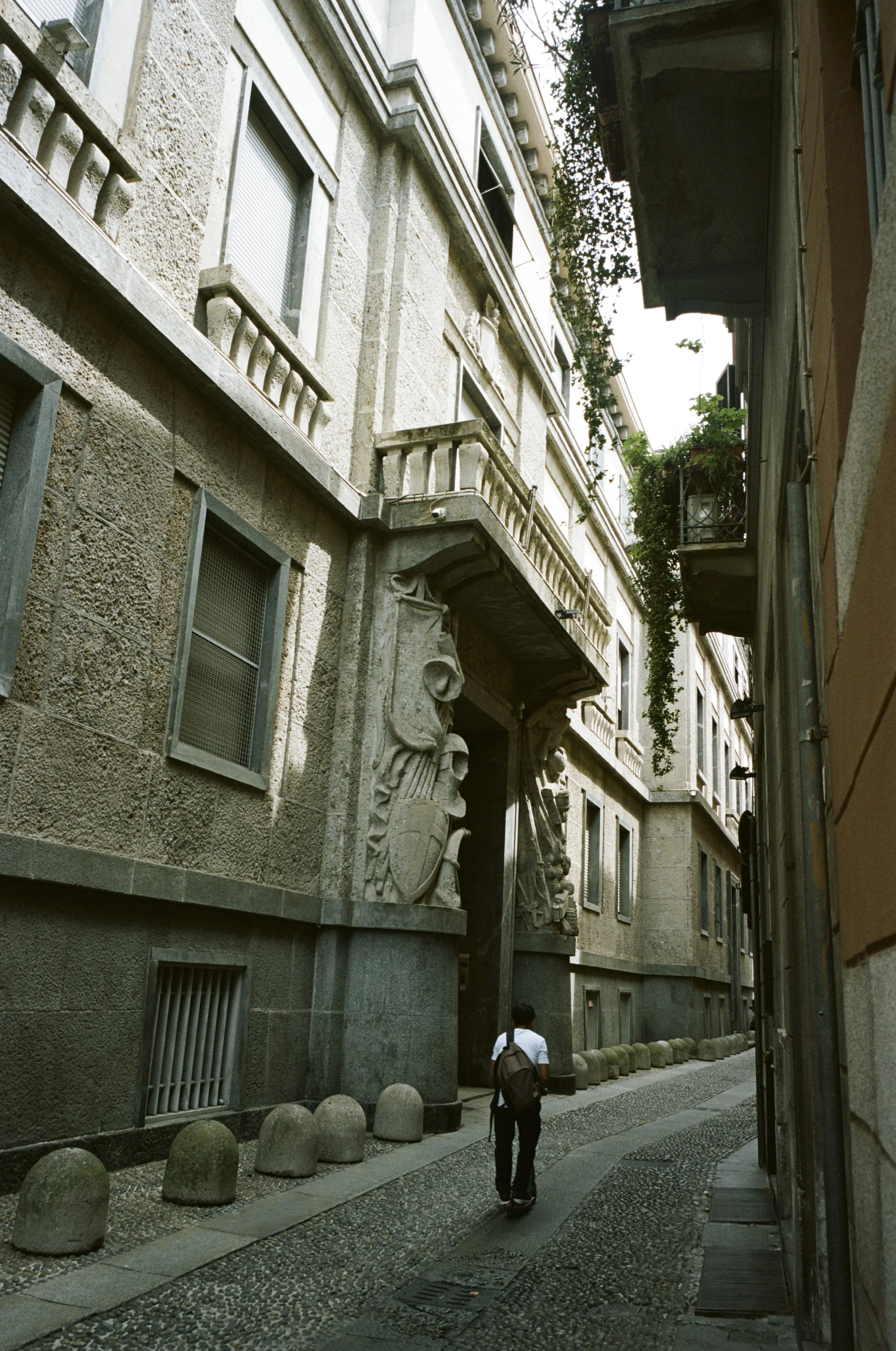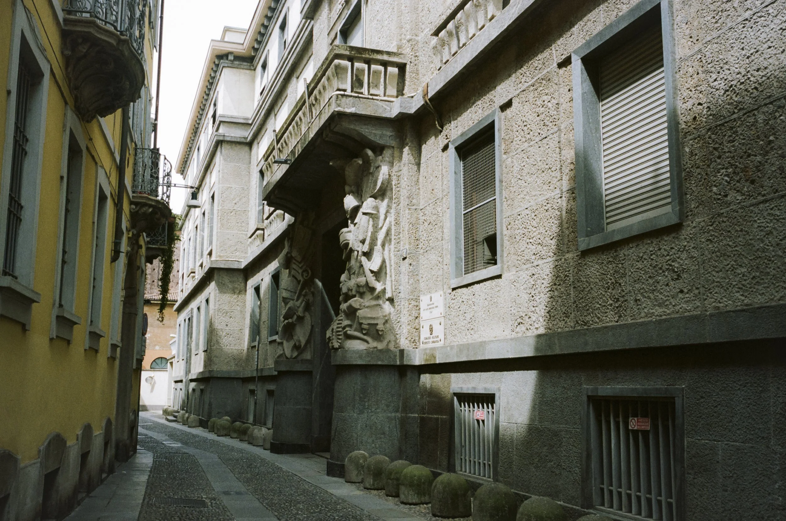 Nowadays, people walk down the narrow Via del Carmine without giving much thought to this private entrance – always closed, its windows tightly shut. But if you happen to stop and take a look, you could almost smile at the sight of the two dressed warfare-columns – one medieval, the other Fascist – standing right next to a series of concrete urban furniture panettoni by Enzo Mari, self-proclaimed communist designer. History is not a static record but a dynamic process, which can be quite ironic at times, too.