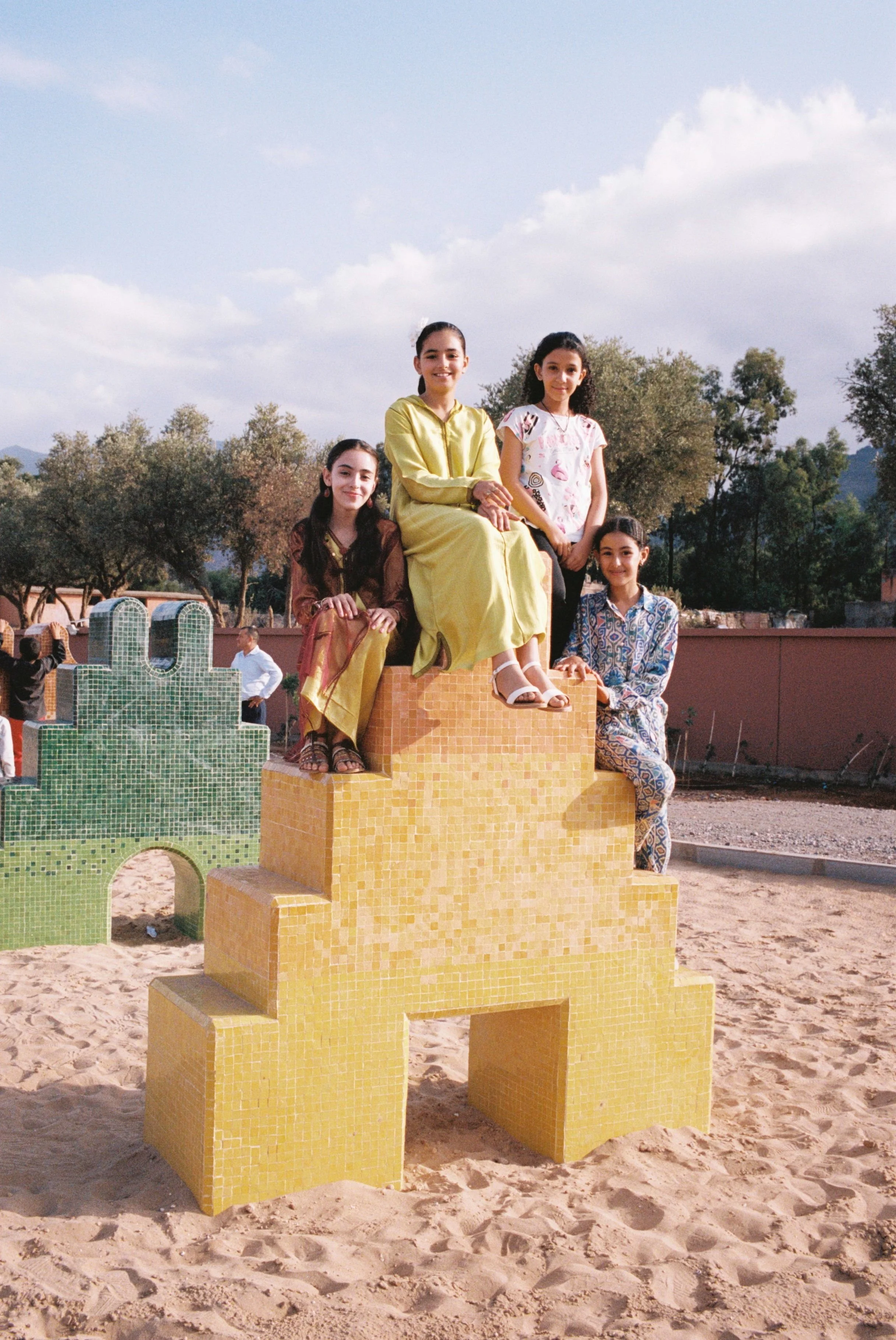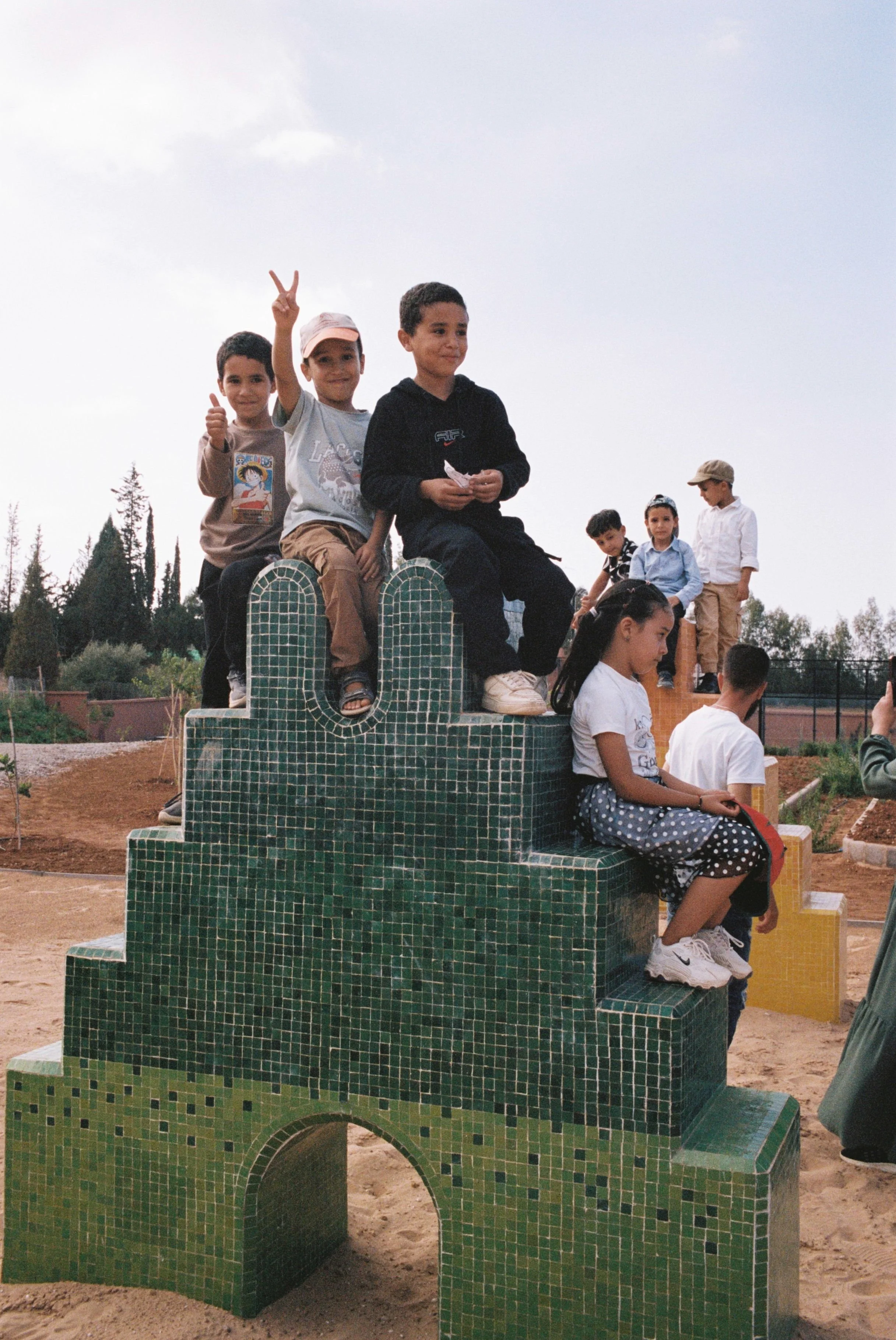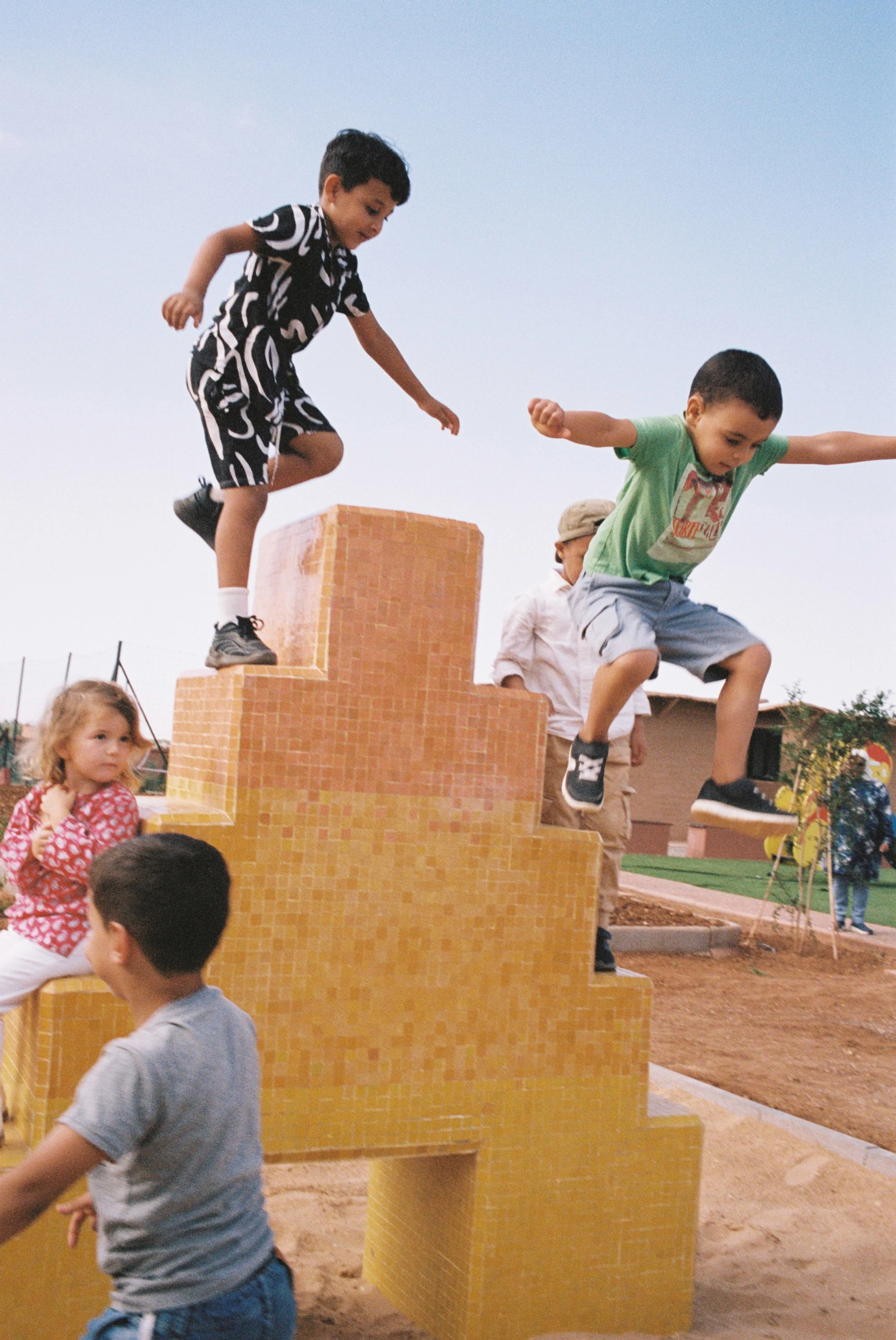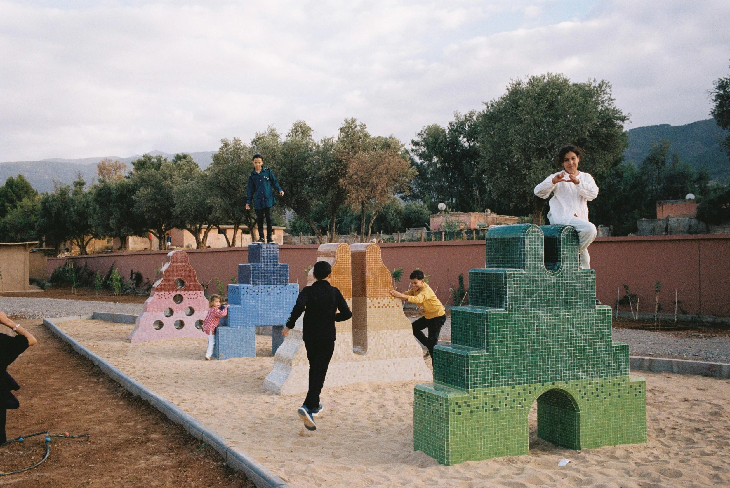 The first design is in my notebook: a series of portals in black ink, a path of transformation, each portal leading to a new stage, a new experience. I liked this idea so much that I made the models on a small scale in plaster. They were there waiting for a sign to be built in the real world. Two years ago, there was an earthquake in Morocco, and I needed to help but didn’t know how. Pablo Bofill, my husband, put me in contact with the building company SGTM and Elke Bardor who were at the heart of the construction of the orphanage in Amizmiz (where the earthquake hit the strongest) along with The Moroccan Association for Aid to Children in Precarious Situations lead by Touraya Bouabid. Suddenly it all made sense, the portals were meant to be there, to become a playground for the children.