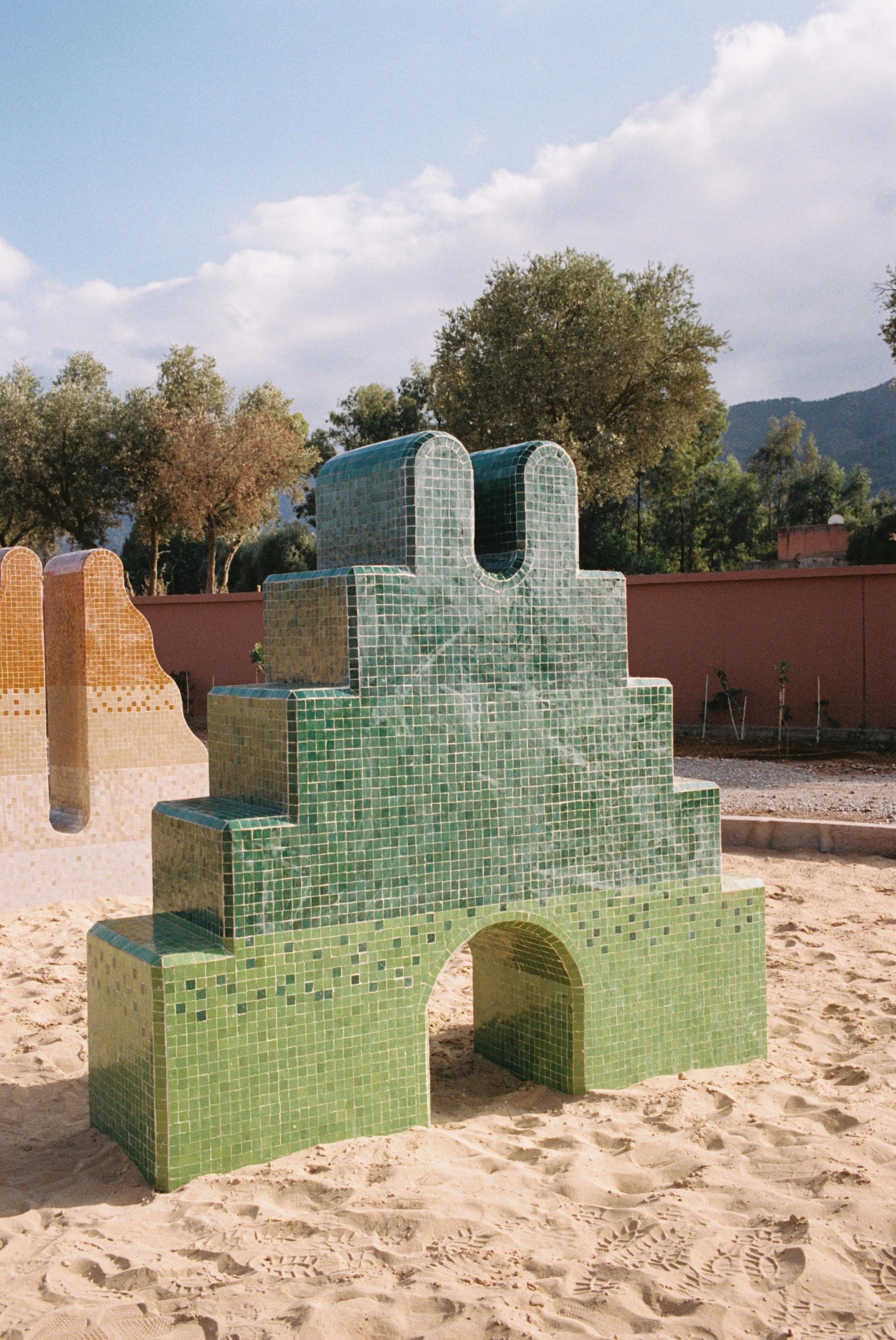 LP: The Zellige tiles, Moroccan glazed terracotta handmade mosaics, were perfect for this project. This material brings together cultural heritage and craftsmanship that is very much alive. It’s a colorful, playful, and noble material, ideal for the outdoors. Local artisans prepared each color and applied the tiles to the sculpture. Together, we created a continuum of color for each sculpture, from darker to lighter.